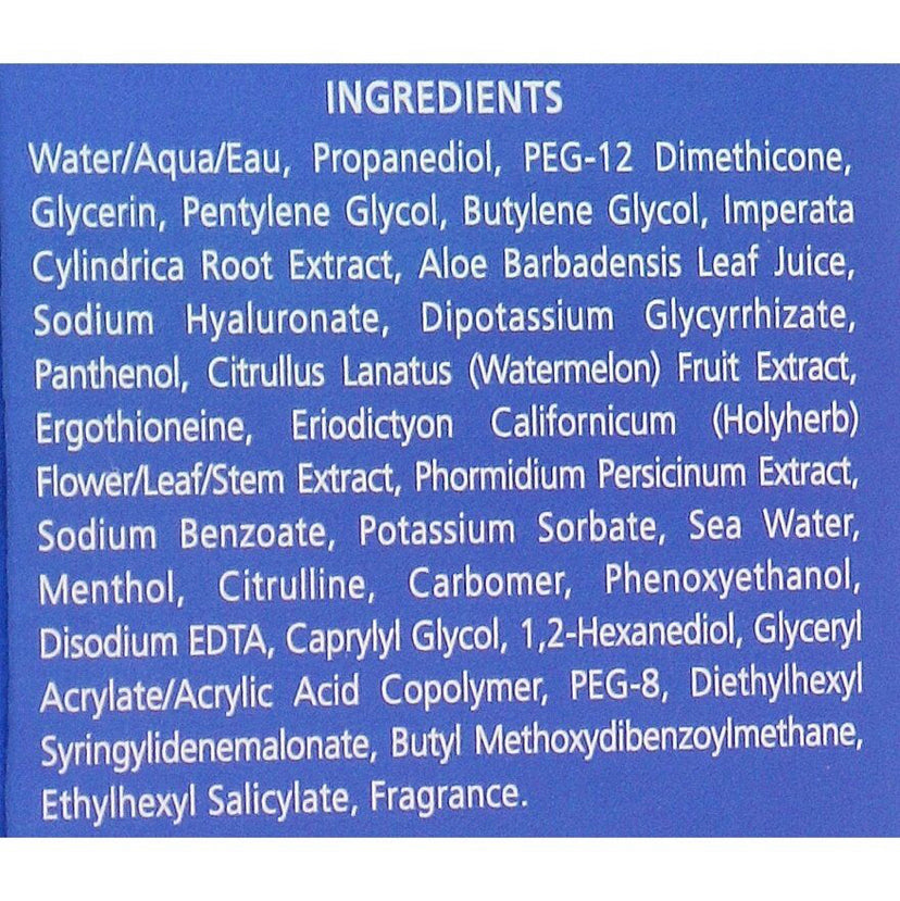 Water/Aqua/Eau, Propanediol, PEG-12 Dimethicone, Glycerin, Pentylene Glycol, Butylene Glycol, Imperata Cylindrica Root Extract, Aloe Barbadensis Leaf Juice, Sodium Hyaluronate, Dipotassium Glycyrrhizate, Panthenol, Citrullus Lanatus (Watermelon) Fruit Extract, Ergothioneine, Eriodictyon Californicum (Holyherb) Flower/Leaf/Stem Extract, Phormidium Persicinum Extract, Sodium Benzoate, Potassium Sorbate, Sea Water, Menthol, Citrulline, Carbomer, Phenoxyethanol, Disodium EDTA, Caprylyl Glycol, 1,2-Hexanediol, Glyceryl Acrylate/Acrylic Acid Copolymer, PEG-8, Diethylhexyl Syringylidenemalonate, Butyl Methoxydibenzoylmethane, Ethylhexyl Salicylate, Fragrance.